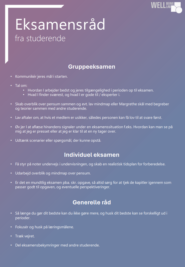 On the Wellbeing Lab website under “tools“, you can find a variety of conversations on individual and group exam preparation.